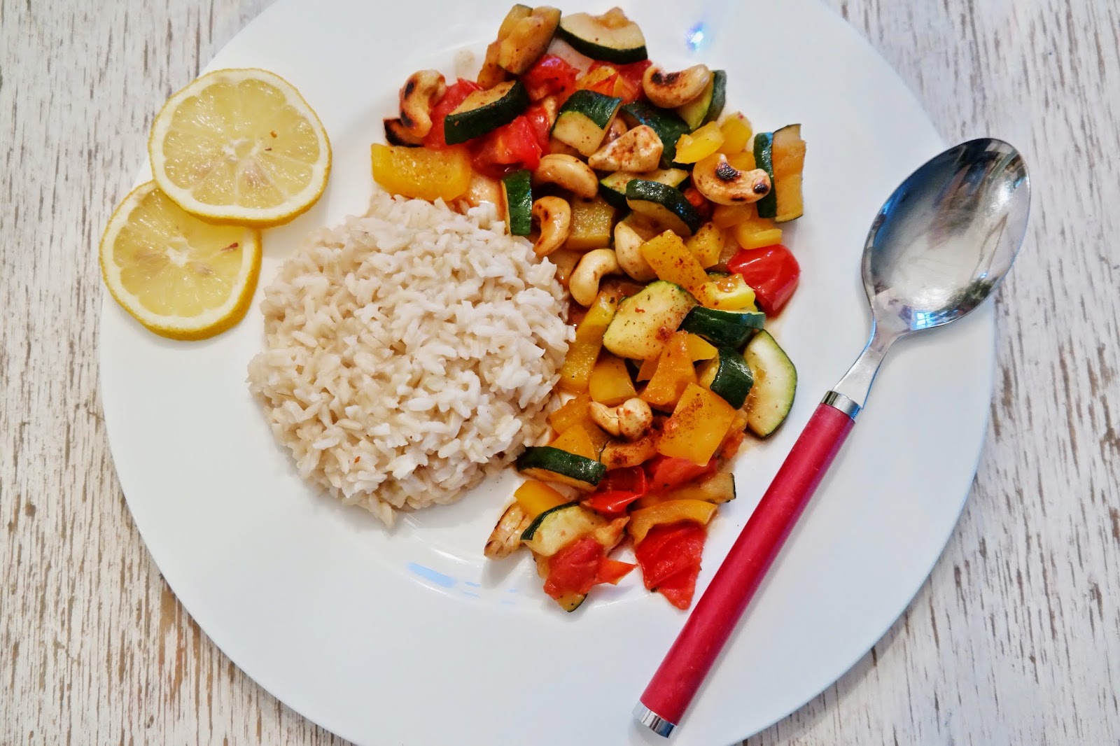 Asiatische Gerichte dürfen bei mir auch nie fehlen! Das ist Reis mit Gemüse und Soja Soße. Den Reis habe ich etwas mit Zitrone beträufelt. Statt Reis esse ich aber noch lieber Quinoa.